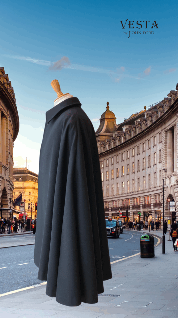 贅沢に円形に最高級生地を裁断。豊かなドレープと流れるような艶は、ヴェスタのマントならでは。