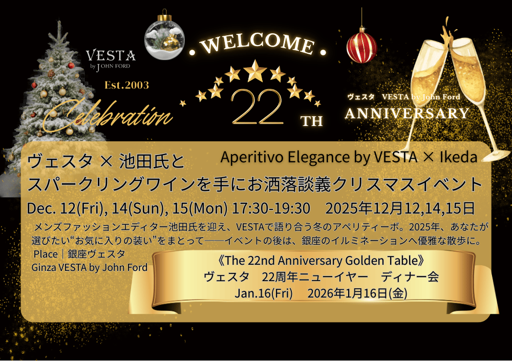 銀座でオーダースーツを手がけるVESTA by John Ford(ヴェスタ)は、2025年12月、皆さまのご愛顧のおかげで22周年を迎えます。