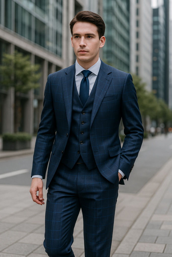 Navy or charcoal tones with delicate grid or shadow checks express intelligence, reliability, and quiet confidence.